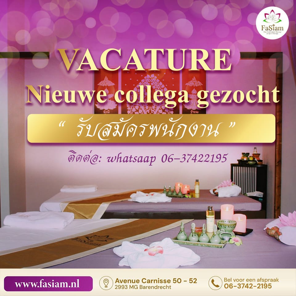 Voor onze nog steeds groeiende klantenkring zijn wij op zoek naar nieuwe collega’s. Heb je diploma’s en/of ervaring met massage? Neem dan contact met ons op via tel. nr. 06-37422195.
